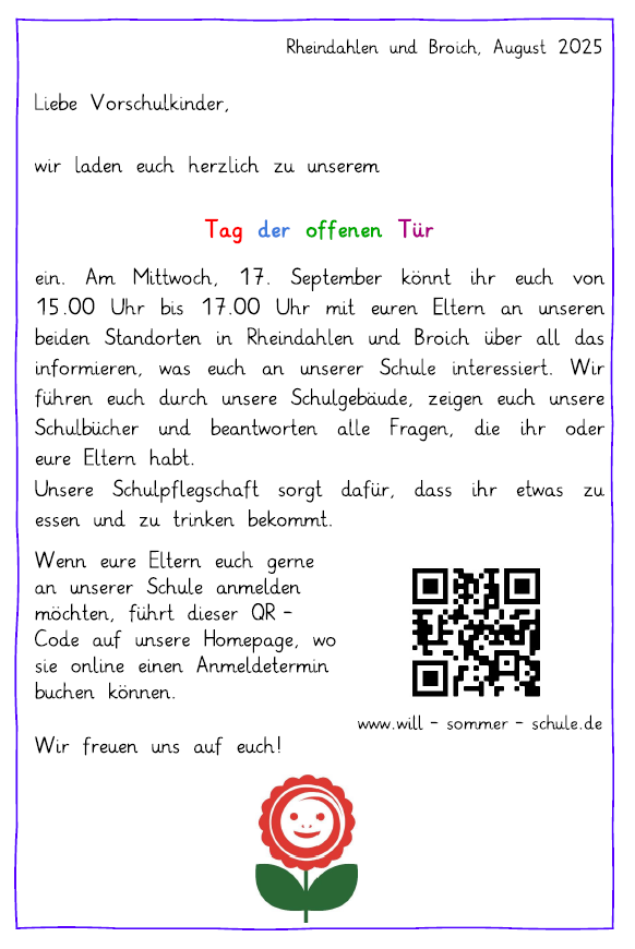 Falls Sie sich unsere Schule gerne vorab anschauen möchten, laden wir Sie und Ihr Kind herzlich zu unserem Tag der offenen Türe ein. Er findet an beiden Standorten (Rheindahlen und Broich) am Mittwoch, 17.09.2025 von 15.00 Uhr bis 17.00 Uhr statt.