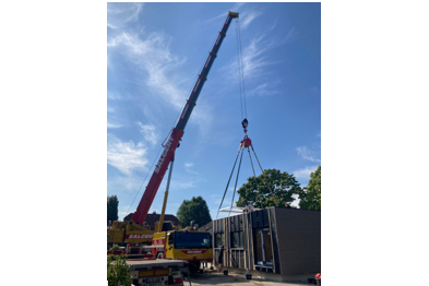 Heute konnten alle Lehrerinnen und Lehrer zuschauen, wie auf unserem Schulhof in Rheindahlen ein Container aufgebaut wurde. Mit einem großen Kran wurden die vorgefertigten Teile an die richtige Stelle gebracht und auf das bereits letzte Woche gegossene Fundament aufgesetzt. Noch stehen einige Arbeiten zum Innenausbau und zur Verkleidung der Außenfassade an, aber in wenigen Wochen stehen uns zwei zusätzliche helle Unterrichtsräume zur Verfügung.